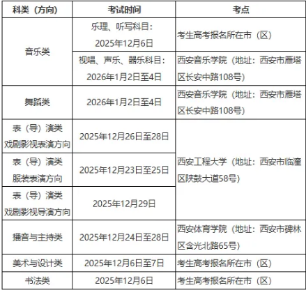 一、報名 報考藝術類專業(yè)的考生,必須參加我省高考報名,報考科類只能選擇為藝術類(歷史)或藝術類(物理)。 (一)省級統(tǒng)考報名 擬報考藝術類專業(yè)課省級統(tǒng)考的考生,須于2025年11月1日9∶00至11月7日17∶00使用高考報名號及密碼登錄陜西省教育考試院門戶網(wǎng)站(https://www.sneea.cn)或陜西招生考試信息網(wǎng)(https://www.sneac.com),在高考網(wǎng)上報名及繳費的同時,完成藝術類專業(yè)課省級統(tǒng)考報名及繳費,繳費方式與高考網(wǎng)上報名相同。省級統(tǒng)考科類一經(jīng)確認不得更改。 我省藝術類專業(yè)課省級統(tǒng)考分為音樂類、舞蹈類、表(導)演類、播音與主持類、美術與設計類、書法類6個科類,考生只能在其中選擇1個科類報考,不得兼報。音樂類專業(yè)課省級統(tǒng)考分為音樂教育、音樂表演2個招考類別,考生可以兼報;音樂表演招考類別又分為聲樂、器樂2個方向,考生只能在其中選擇1個方向報考,不得兼報。表(導)演類專業(yè)課省級統(tǒng)考分為戲劇影視表演、服裝表演、戲劇影視導演3個方向,考生只能在其中選擇1個方向報考,不得兼報。 報考音樂類、舞蹈類、表(導)演類戲劇影視表演方向、表(導)演類服裝表演方向的考生,還須填報或上傳相關資料,具體方式詳見報名系統(tǒng)公告。 藝術類本科考試招生專業(yè)目錄詳見《陜西省招生委員會關于印發(fā)陜西省加強和改進普通高等學校藝術類專業(yè)考試招生工作實施方案(試行)的通知》,藝術類高職(專科)專業(yè)參照執(zhí)行。考生須在省級統(tǒng)考報名前咨詢擬報考院校,主動了解擬報考院校藝術類專業(yè)與我省省級統(tǒng)考科類的對應關系,各招生院校要明確告知考生須參加我省省級統(tǒng)考的科類(招考類別、方向)。 (二)高校校考報名 藝術類專業(yè)課校考報名及考試辦法由各招生院校確定,考生可直接向擬報考的招生院校咨詢。報名時,如須提供《藝術類專業(yè)課考試報考證》,考生可于2025年11月25日后登錄陜西省教育考試院門戶網(wǎng)站或陜西招生考試信息網(wǎng)下載。 二、考試 (一)省級統(tǒng)考 各科類藝術類專業(yè)課省級統(tǒng)考考務辦公室負責省級統(tǒng)考的組織實施。音樂類、舞蹈類專業(yè)課省級統(tǒng)考考務辦公室設在西安音樂學院。表(導)演類專業(yè)課省級統(tǒng)考考務辦公室設在西安工程大學。播音與主持類專業(yè)課省級統(tǒng)考考務辦公室設在西安體育學院。美術與設計類、書法類專業(yè)課省級統(tǒng)考考務辦公室設在西安美術學院。音樂類樂理、聽寫科目,美術與設計類,書法類考試的組考工作由各市(區(qū))招生考試機構負責。 各科類(方向)考試時間和考點安排如下: 考生參加考試的時間以準考證為準。音樂類樂理、聽寫科目,美術與設計類,書法類準考證可于考試前一周登錄陜西省教育考試院門戶網(wǎng)站或陜西招生考試信息網(wǎng)下載并打印。音樂類視唱、聲樂、器樂科目,舞蹈類,表(導)演類,播音與主持類準考證可于考試前一周登錄組考院校網(wǎng)站下載并打印。 藝術類專業(yè)省級統(tǒng)考考試說明詳見《陜西省招生委員會關于印發(fā)陜西省加強和改進普通高等學校藝術類專業(yè)考試招生工作實施方案(試行)的通知》。 (二)高校校考 藝術類專業(yè)課校考實施辦法由各招生院校負責制定并向社會公布,實施辦法必須符合教育部和我省關于藝術類專業(yè)考試招生的有關規(guī)定。 組織校考的招生院校不得接受我省相應類別省級統(tǒng)考不合格考生參加校考,省級統(tǒng)考成績不合格考生參加院校相應專業(yè)組織的校考,其校考成績一律無效。違反上述規(guī)定產(chǎn)生的遺留問題,責任由招生院校和考生自負。各招生院校藝術類專業(yè)課校考成績只適用于本校錄取。 (三)成績發(fā)布 藝術類專業(yè)課省級統(tǒng)考成績將于2026年1月底公布。成績公布后考生如對本人成績有疑問,在規(guī)定時間內(nèi)可提出成績復核申請,考生成績復核內(nèi)容包括考生個人相關信息、是否考生本人答卷、是否有漏評、得分是否漏統(tǒng)(登)、分數(shù)合計是否準確。成績復核不重新評分,評分標準、評分細則的寬嚴問題不在復查范圍之內(nèi)。考生不得查看答卷和面試錄像。 三、有關要求 (一)嚴格保密制度。各市(區(qū))、縣(區(qū)、市)招生考試機構、各組考院校要加強試題、試卷的安全保密管理。藝術類專業(yè)課考試試題(卷、卡)的領取、運送、保管、分發(fā)、回收、評卷等環(huán)節(jié)要嚴格按《國家教育考試考務安全保密工作規(guī)定》執(zhí)行,務必確保試題(卷、卡)安全保密、萬無一失。要加強對命題、評卷(面試)和監(jiān)考教師等考試工作人員的崗前教育培訓。要針對當前考試安全保密的新形勢、新特點以及藝術類專業(yè)課考試的特殊性,開展規(guī)范化、專業(yè)化的全員業(yè)務培訓,強化職業(yè)道德和法紀警示教育,增強安全保密觀念和遵紀守法意識。 (二)嚴格考務管理。各市(區(qū))、縣(區(qū)、市)招生考試機構、各組考院校要制定詳細嚴密的藝術類專業(yè)課考試實施方案,建立健全考試組織的各項規(guī)章制度,務必做到考試、評卷(評分)、登分、統(tǒng)計合成等各個環(huán)節(jié)規(guī)范嚴謹。嚴把考試入口關,通過“人臉識別”